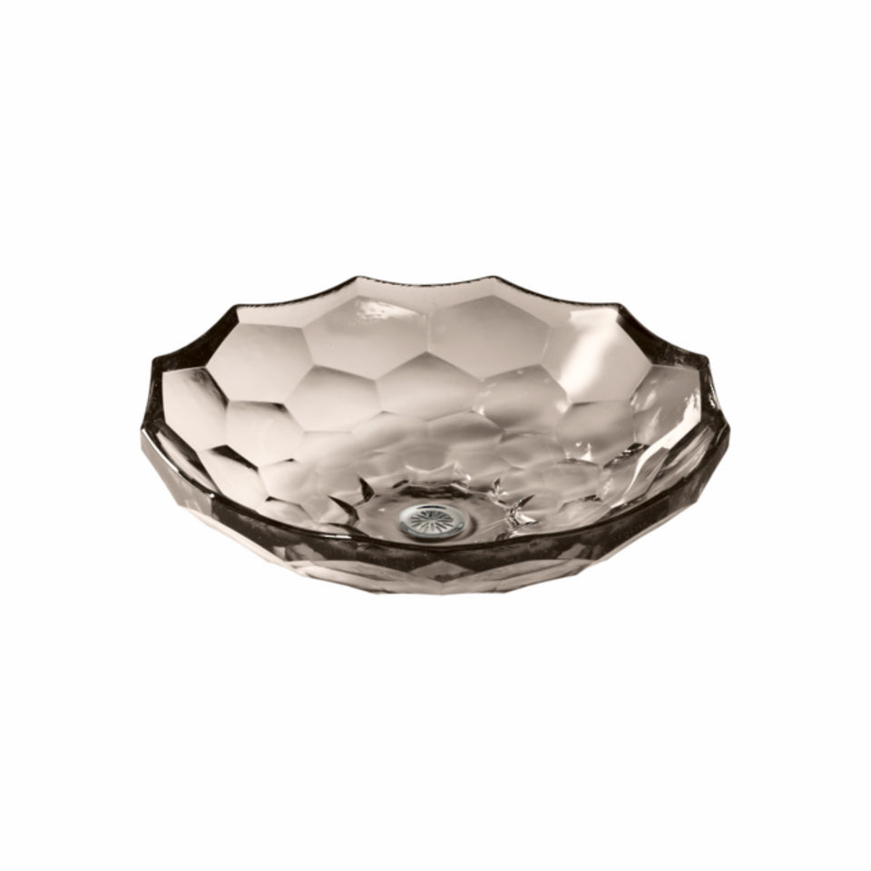 The Briolette glass sink displays a uniquely faceted shape inspired by the precisely cut surfaces of precious stone. Gently curved walls highlight the natural textural qualities of glass and create a striking reflective effect. This sink sits on top of the counter as a brilliant addition to your bath or powder room.
