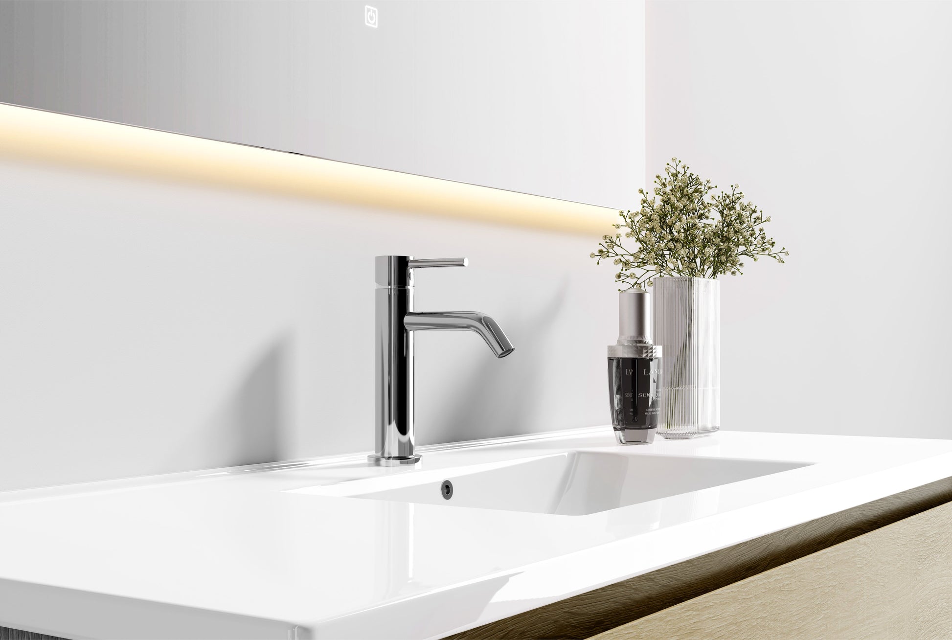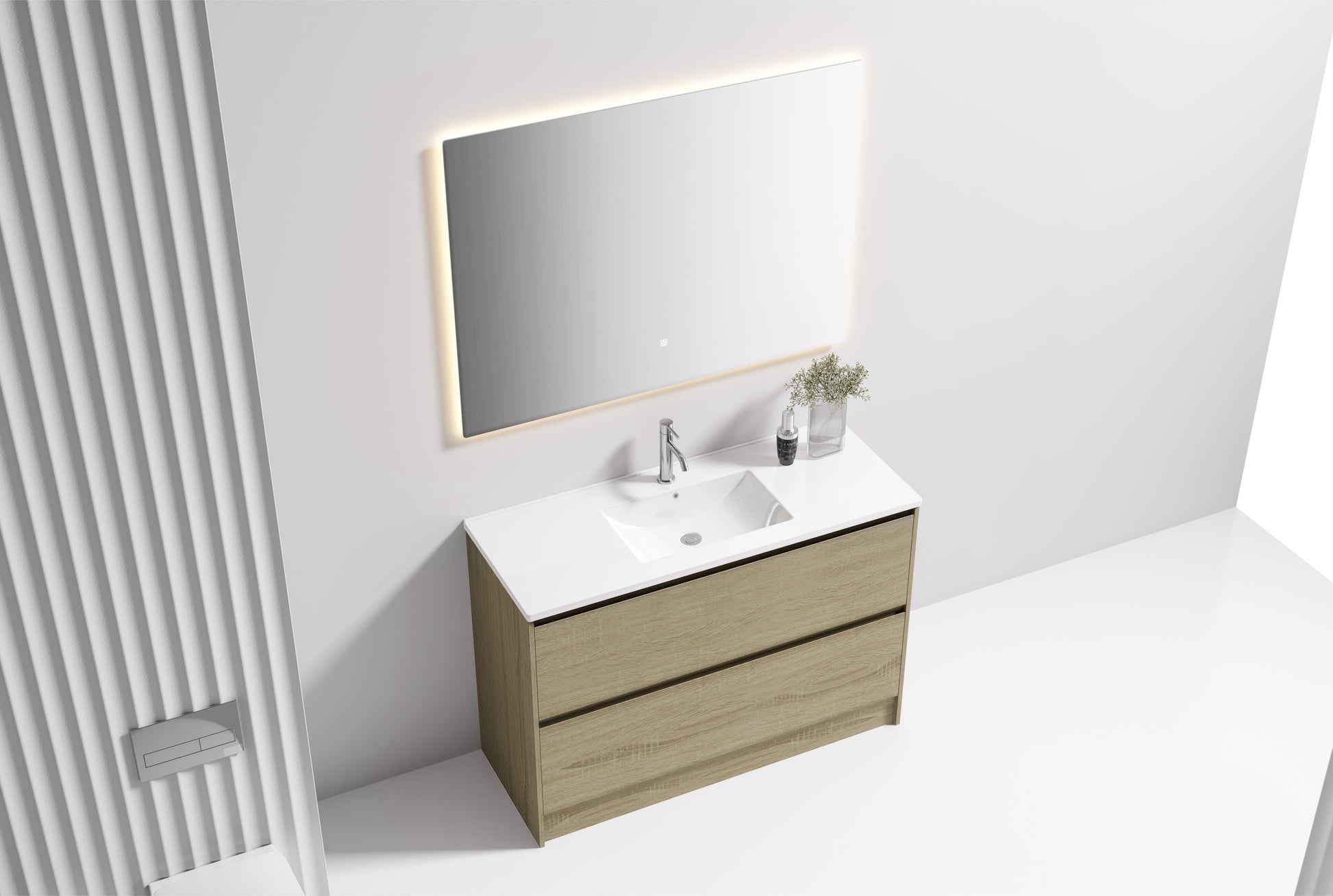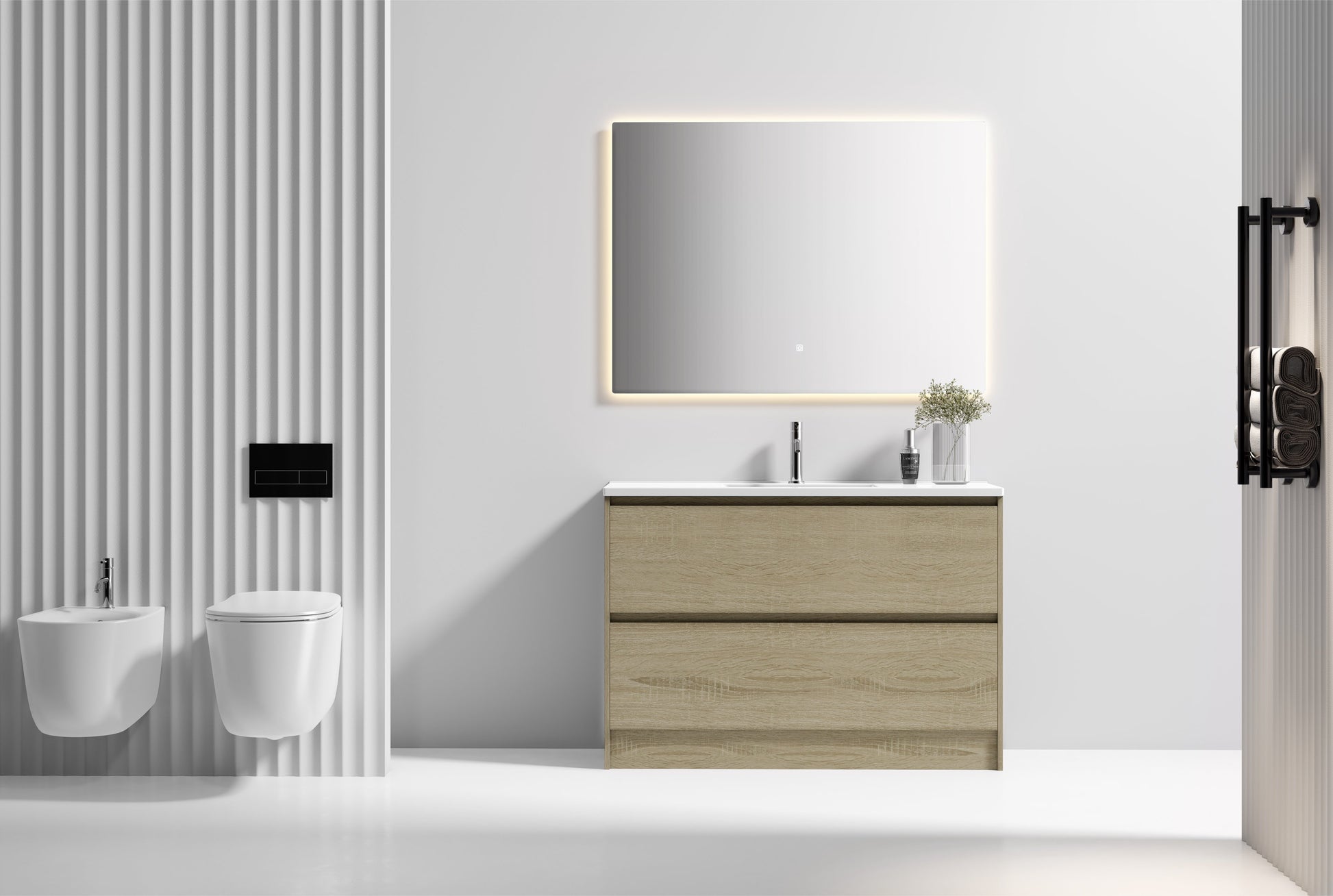 Made from 9-layer plywood and finished with a North American Oak melamine coating, this vanity offers durability with a refined natural wood look. Its hidden handle and 45° pull-to-open design add a sleek, minimalist touch, perfect for modern interiors.